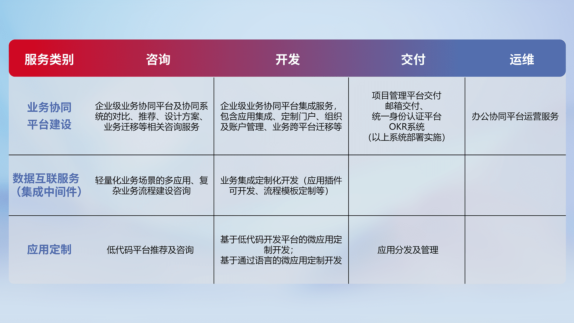 针对钉钉、、、、企微、、IDaas等平台级产品提供产品的规划、、、方案、、、交付、、、、定制化开发等服务,,实现如统一协同办公、、智能客户服务、、混合会议管理、、、智能数据查询、、等业务场景,,,,实现数字化转型。。。